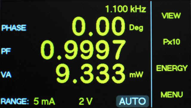 ?以功率和伏安數的比值作為功率因數。它的范圍是從0到±1.0000,而且伏安乘積大于滿量程的7.5%時,功率因數的分辨率為0.0001。當伏安乘積下降時功率因數的分辨率也會下降。當頻率低于250kHz時功率因數的是±0.002 ±10,當頻率從 250kHz 到500kHz時功率因數的不確定性為±0.004 ±20個字,當頻率從 500kHz 到1000kHz1)時功率因數的不確定度為±0.008 ±40個字。