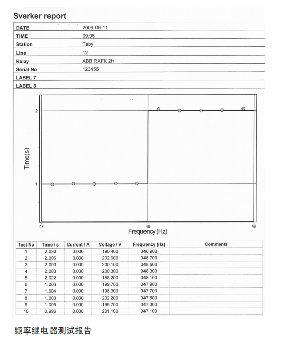 在繼電器測(cè)試時(shí),每個(gè)被測(cè)值儲(chǔ)存在日志明細(xì)表上。您可在這張表的每個(gè)測(cè)試點(diǎn)添加評(píng)論。當(dāng)整個(gè)測(cè)試完成后,您可以把所有內(nèi)容保存為數(shù)據(jù)文件。稍后您可以打印測(cè)試結(jié)果。您可以不用現(xiàn)場(chǎng)寫報(bào)告,從而節(jié)省了時(shí)間。所有的報(bào)告書寫可以在辦公室方便地完成。SVERKER Win軟件提供了連接說明、測(cè)試說明和其他您需要預(yù)先準(zhǔn)備事項(xiàng)的簡(jiǎn)單調(diào)閱。這些圖形和文字說明的準(zhǔn)備可以使用標(biāo)準(zhǔn)Word處理包。