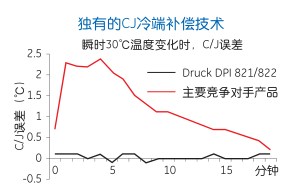 ?DPI 821/822采用了Druck獨(dú)有的冷端補(bǔ)償技術(shù),幾乎消除了校驗(yàn)儀器中由于環(huán)境溫度的瞬間變化而造成 的冷端補(bǔ)償誤差,可以看出一般的設(shè)備至少需要20分鐘的時(shí)間才能消除這種誤差