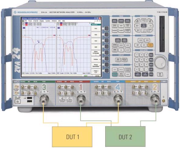 R&S?ZVA 的發(fā)生器設計,使得每個測試端口都可以同時作為信號源和接收機使用。 因此,可以對測試端口進行分組。 在各個測試端口組上進行的測量任務可以彼此實現(xiàn)同步。 因而,可以并行地測量多個 DUT 或者一個 DUT 的多個通路; 測量時間僅相當于測量一個設備所需要的時間。 因此,同時測量兩個兩端口DUT時,速度將提高一倍;同時測量四個單端口DUT時,速度將是原先的四倍。