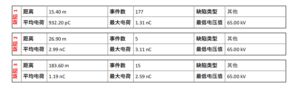 具體放電數(shù)據(jù)描述見《數(shù)據(jù)》條目。因國(guó)內(nèi)未有超低頻局放測(cè)66kV電纜的標(biāo)準(zhǔn)規(guī)范,暫依據(jù)《IEEE400.3》草案進(jìn)行判斷:5年以上電纜放電起始電壓不超過(guò)1.15U0(50*1.15=57.5kV)<65kV,局放符合標(biāo)準(zhǔn)要求。