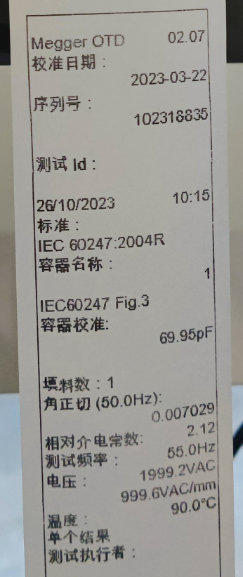 北京康高特儀器設(shè)備導(dǎo)讀:10月26日,錫林郭勒供電公司某變電站主變油樣介損測試。使用MEGGER OTD 絕緣油介損測試儀,設(shè)備將油升溫至90℃,然后使用2000VAC進行測試。