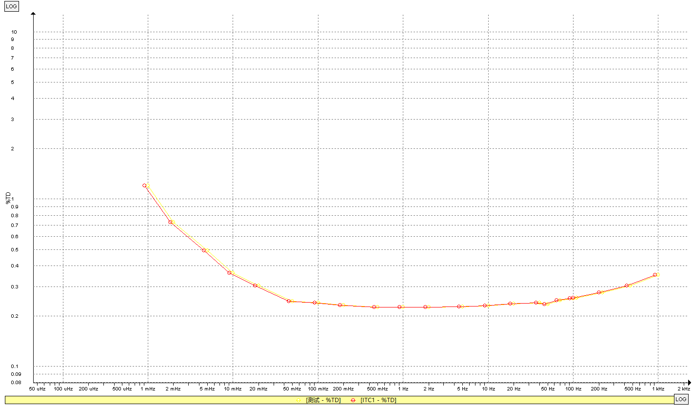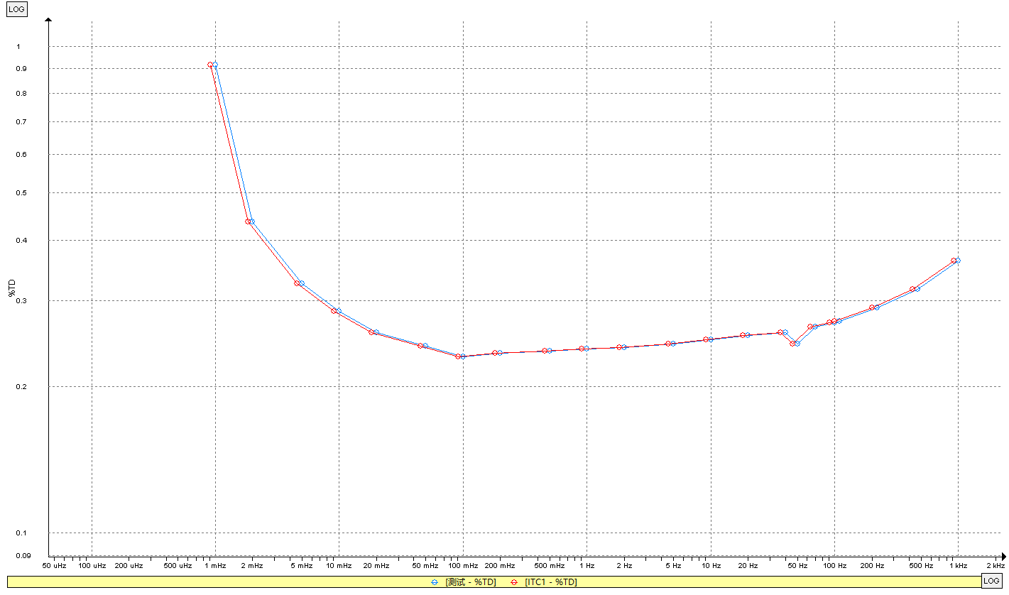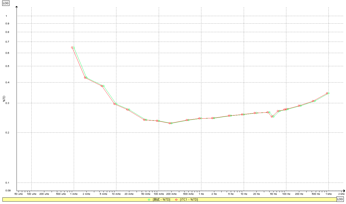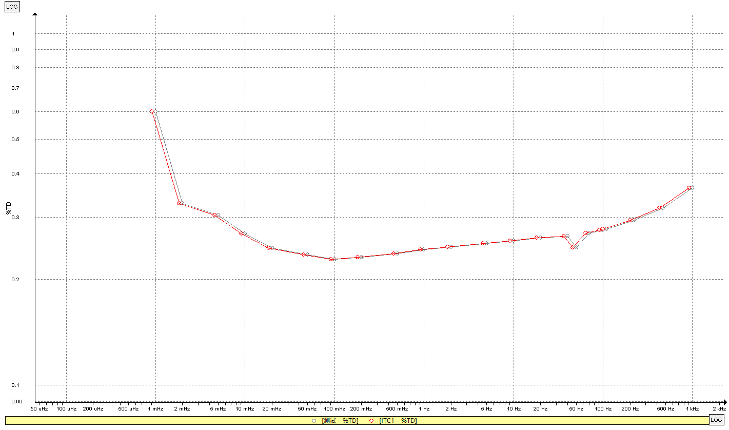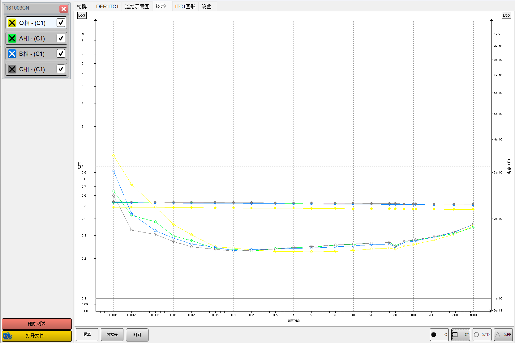 可以看到,測試結果曲線與模型曲線十分平滑且基本一致。模型曲線與測試曲線有偏移的原因是溫度不同。(介質譜分析測試的是各個不同頻率下的電容值和介損值,并繪制成電容和介損的頻率曲線。介質譜曲線能夠更為清晰地反映絕緣的狀態,并且有助于判斷測試結果是否存在異常。介損隨頻率改變,從左到右頻率逐次增大。)